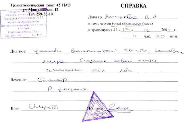 Справка из травмпункта – официальный медицинский документ, при помощи которого можно решить целый ряд проблем. Именно она фиксирует побои и способна закрыт пропуски на работе. Но процедура получения справки о побоях из травмпункта непременно ознаменуется долгим ожиданием и потерей времени. Мы предлагаем избежать перечисленных сложностей. Вы можете просто купить справку из травмпункта в Москве и при этом спокойно заниматься своими делами.