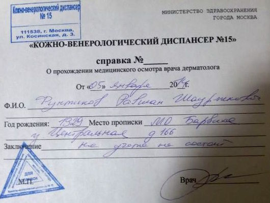 Врач-дерматолог проводит осмотр и только после этого выпишет официальный бланк. Следует отметить, что справка от врача-дерматолога обязательно должен быть заверен печатью и подписью. При обнаружении каких-либо высыпаний на коже могут быть дополнительно назначены анализы, например, соскоб или любой другой вид. С его помощью определяют точный диагноз.
