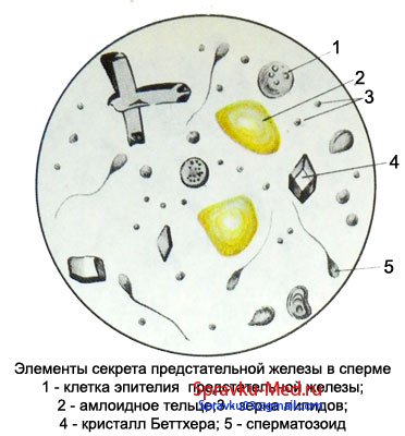При нормальном состоянии в жидкости не должны присутствовать эритроциты, сперматозоиды, кристаллы Бетхера, амилоидные тельца.