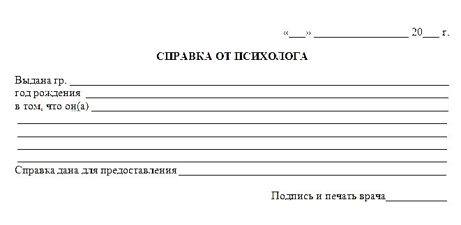 отражена информация о бывших или имеющихся на данный момент проблемах. Также справка может подтверждать отсутствие каких-либо патологий. Именно поэтому справка от психолога может быть затребована в следующих случаях: